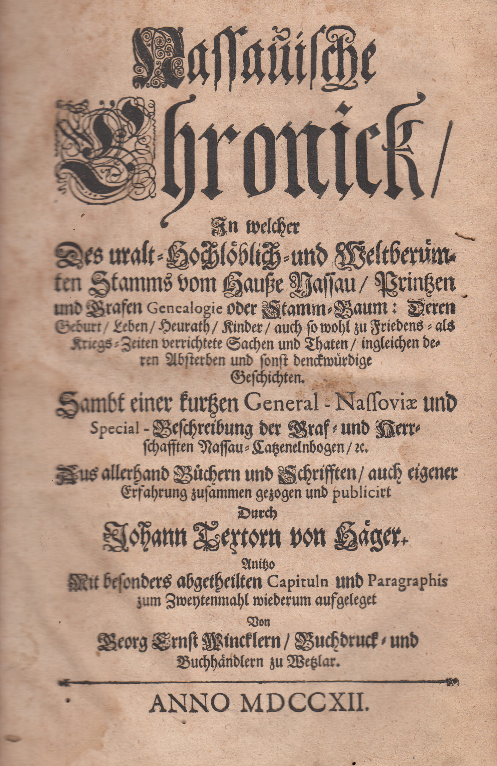 Erste Seite der Nassauischen Chronik von Johann Textor von Haiger, die im Jahr 1712 von den Buchhändlern und Buchdruckern Winckler aus Wetzlar gedruckt wurde und nun aus dem Vorlass Roth in die Bestände des Stadtarchivs Montabaur übergegangen ist; Foto: Hermann-Josef Roth