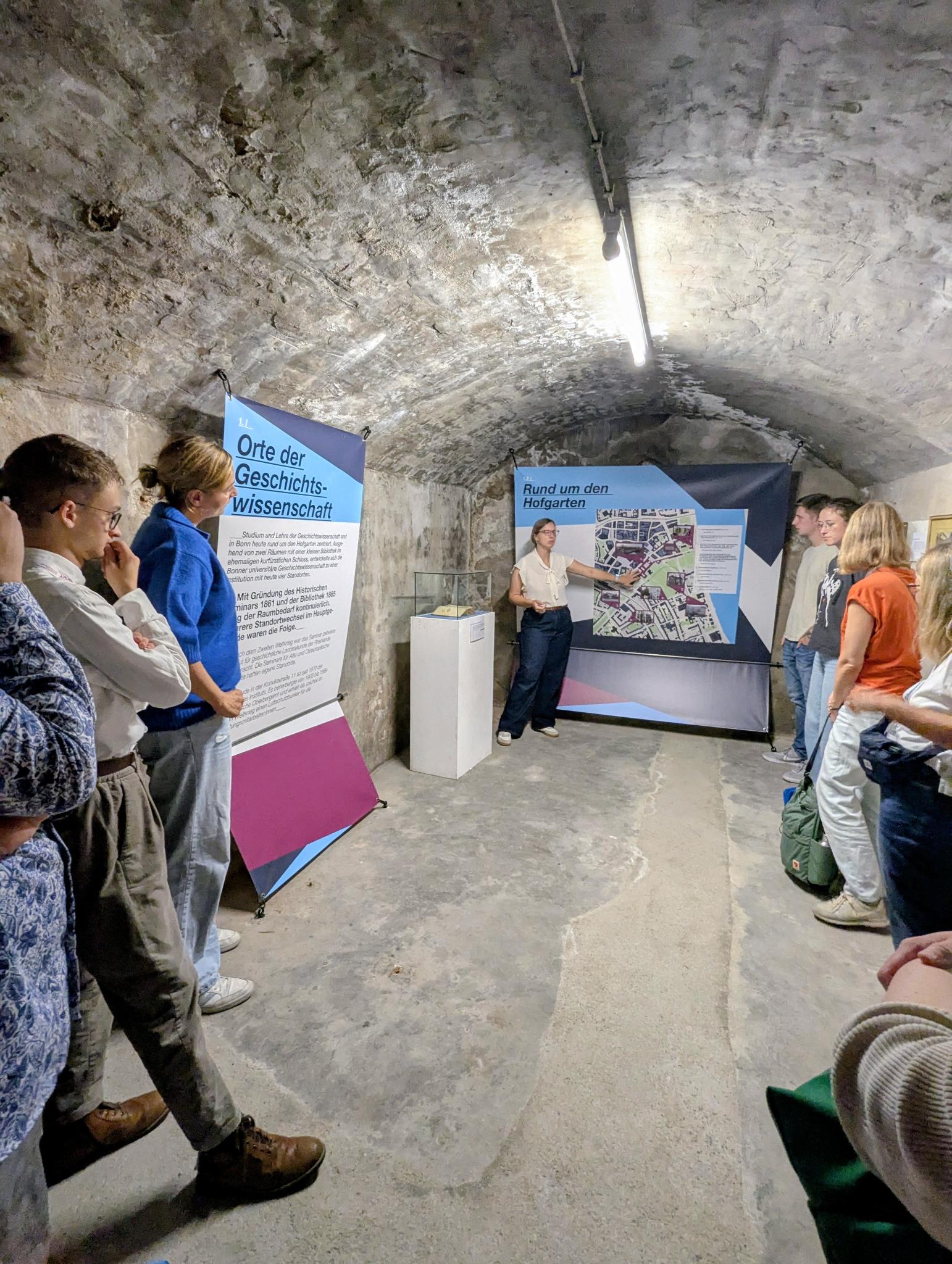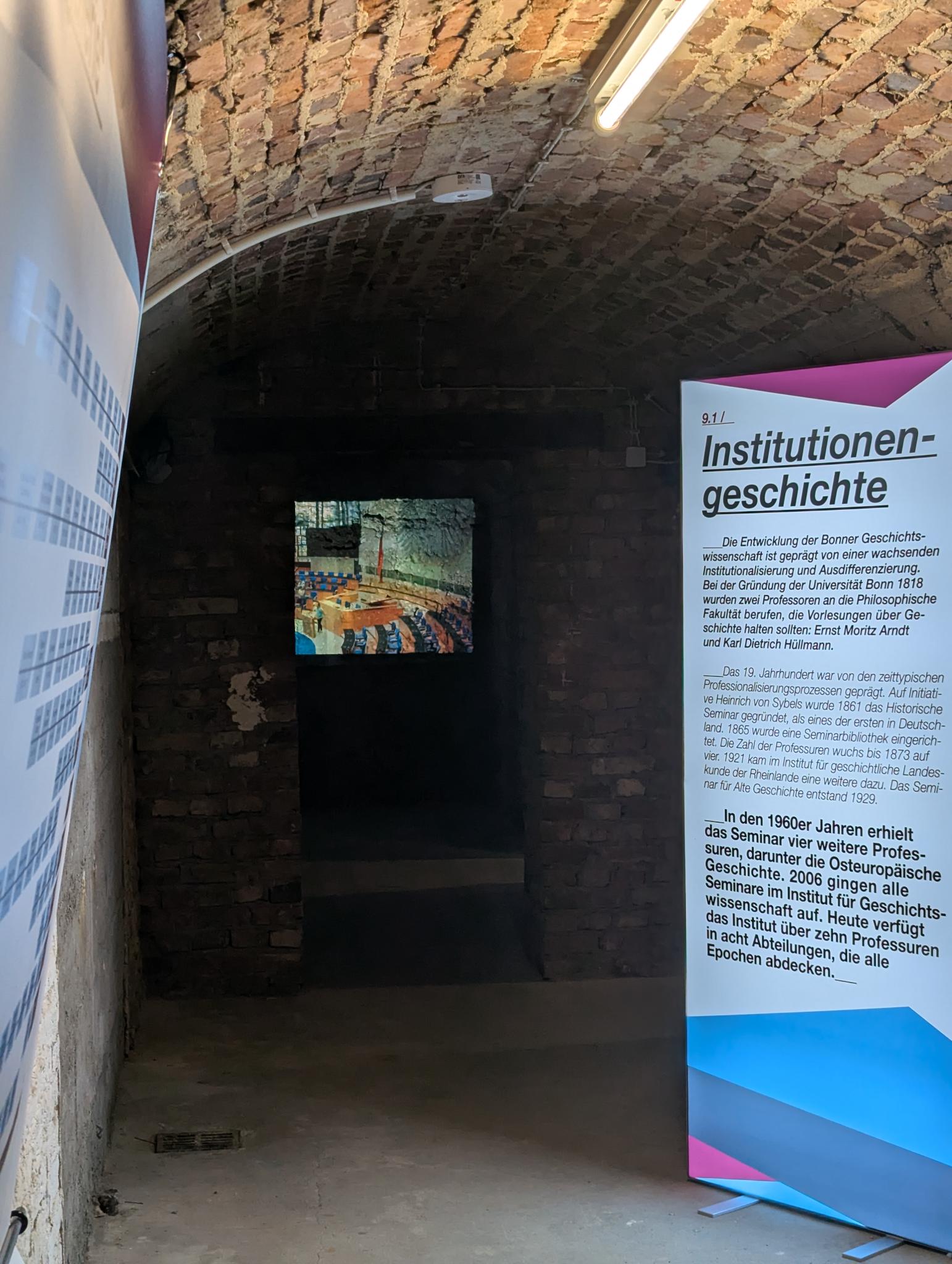 Als Räumlichkeit für die Ausstellung wurde der Bunker unter dem Institutsgebäude in der Konviktstraße 11 gewählt und damit eine besondere Atmosphäre geschaffen. Die Führung stieg im Eingang mit einem chronologischen Überblick ein, an der Wand listete eine Art „Stammbaum“ alle geschichtswissenschaftlichen Professuren seit Gründung der Universität 1818: Aus anfänglich zwei Lehrstühlen wurden mit einem für Alte Geschichte (1865) und einem für historische Hilfswissenschaften (1873) schnell vier; heute verfügt die Bonner Geschichtswissenschaft über zehn Professuren in acht Fachbereichen, die hauptsächlich durch Neueinrichtungen in den 1960er Jahren zustande gekommen waren. Wie für vergleichbare Institutionen üblich, differenzierte sich der Fachbereich also stark aus: Neben jeweils zwei Lehrstühlen für Alte Geschichte und Neuzeit und einem für Mittelalterliche Geschichte vervollständigten die Lehrstühle für Historische Grundwissenschaften, Frühe Neuzeit und Rheinische Landesgeschichte, Verfassungs-, Sozial und Wirtschaftsgeschichte, Osteuropäische Geschichte und Geschichtsdidaktik das Profil von Forschung und Lehre.