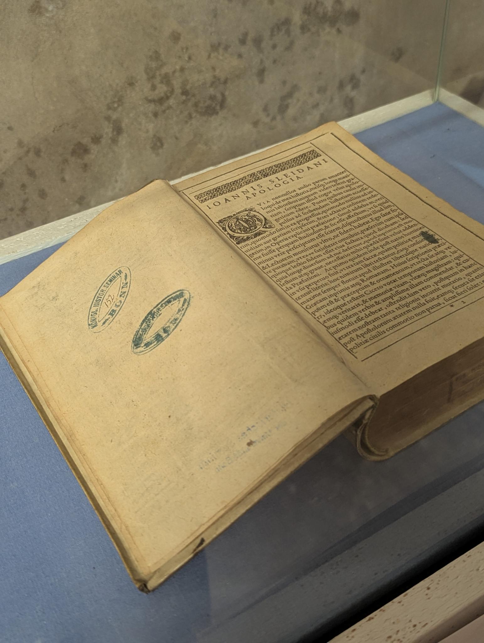 Treffpunkt für die Führungen war der Platz vor dem Institutsgebäude in der Konviktstraße. Der Schriftzug „Glück auf“ über dem Eingang gab zugleich Anlass, darauf hinzuweisen, dass die Historiker*innen erst in den 1970er Jahren in diesen Räumlichkeiten untergebracht wurden und damit das Preußische Bergbauamt ablösten. Der Luftschutzbunker war in den 1930er Jahren für das dortige Personal eingerichtet worden. Umgezogen war die Geschichtswissenschaft in ihrer Historie bereits mehrfach, wie der erste Raum darlegte. Die Fachbereiche lagen auf verschiedene Standorte rund um den Hofgarten verteilt. Einschneidend war für das Historische Seminar die Bombardierung des Hauptgebäudes im Jahr 1944. Aufgrund verloren gegangener Seminarräume musste man auf die Räumlichkeiten der Rheinischen Landesgeschichte ausweichen. Im Zuge der Institutionalisierung des Seminars war 1865 eine Bibliothek eingerichtet und zum Teil mühsam aufgebaut worden. Etwa 90% dieser Seminarbibliothek wurden im Zweiten Weltkrieg zerstört. Eindrücklich veranschaulicht wurde dies in der Ausstellung durch das Buch mit der kleinsten Zugangsnummer (Nummer 152), also dem ältesten erhaltenen Band der Bibliothek. Der Wiederaufbau der Bibliotheksbestände wurde mithilfe von Bücherspenden bewerkstelligt, unter anderen aus dem Ausland oder durch emeritierte Professoren, aber auch aus der Bibliothek der NS-Ordensburg Vogelsang, wo Kader der Nationalsozialisten ausgebildet wurden. Diese Provenienzgeschichte führt dazu, dass bis heute einige Bücher noch Stempel mit Hakenkreuz im Einband aufweisen.
