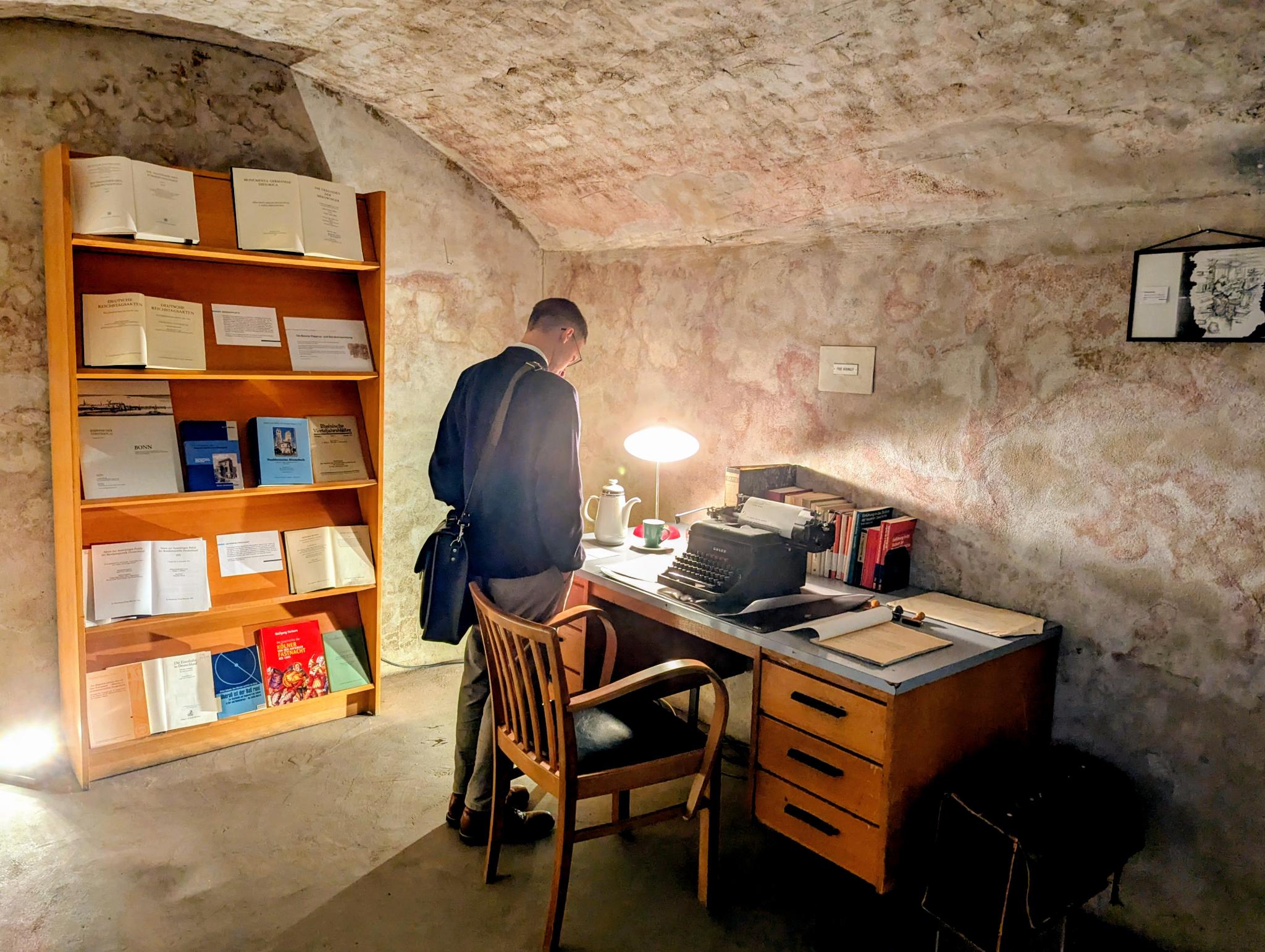 Anschließend besichtigten die Besucher*innen einen imaginären Arbeitsraum eines Bonner Professors. Ein Ensemble aus gefülltem Schreibtisch, Stuhl und Bücherregal repräsentierte dessen verschiedene Tätigkeitsfelder: Die Korrektur einer Hausarbeit, die redaktionelle Arbeit an einer Publikation, wissenschaftliche Recherche und vieles mehr. Die im Bücherregal vertretenen Bände stünden exemplarisch für die Forschungsschwerpunkte der Bonner Geschichtswissenschaft, erklärte Professor Rohrschneider. Laut ihm zeichnet sich diese als Entstehungsort zahlreicher Editionen – wie den Monumenta Germaniae Historica, den Acta Pacis Westphalicae oder den Deutschen Reichstagsakten – durch ihre Quellennähe aus. Das Bild einer rein konservativen, traditionellen und auf Politikgeschichte ausgerichteten Bonner Geschichtswissenschaft greife hingegen zu kurz.