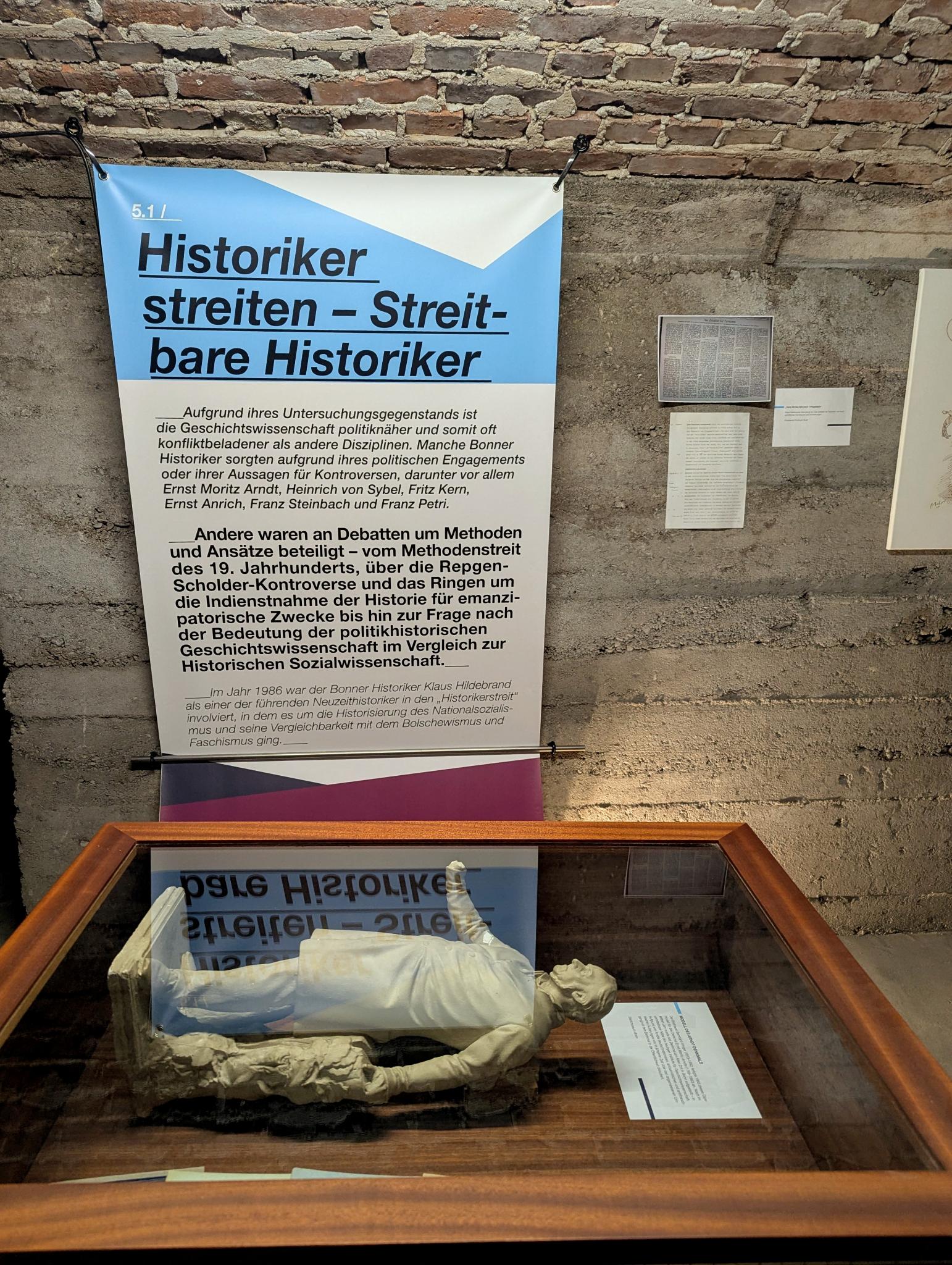 Der Ursprung einer solchen Auffassung wurde im darauffolgenden Raum ersichtlich. Unter der Überschrift „Historiker streiten – Streitbare Historiker“ wurden einige umstrittenere Bonner Geschichtswissenschaftler und die Rolle der Bonner*innen in einzelnen geschichtswissenschaftlichen Debatten in den Blick genommen. In der Öffentlichkeit hatten Bonner Historiker mehrfach Stellung bezogen, etwa Klaus Hildebrand, der sich im Historikerstreit insbesondere in seinem FAZ-Artikel „das Zeitalter der Tyrannen“ an prominenter Stelle geäußert hatte.